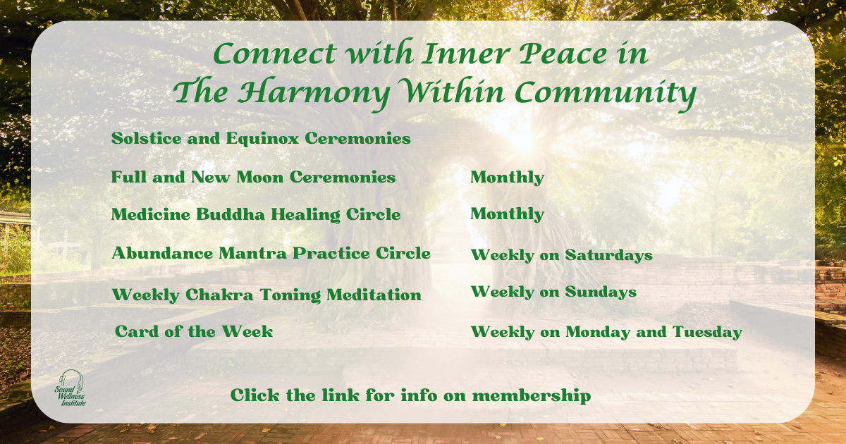 It is time for healers and empaths, or those who are highly sensitive, to step into your role as leaders of the new world being created for and by our human family. The Harmony Within Sanctuary is a Community. It is a sacred space to ignite, or re-ignite, your spiritual practice with like-minded, heart-centered people.